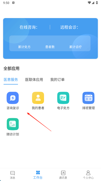 3、進(jìn)入工作臺(tái)頁面,在醫(yī)患服務(wù)分類下找到咨詢復(fù)診應(yīng)用,點(diǎn)擊進(jìn)入該應(yīng)用,可開展患者咨詢復(fù)診相關(guān)工作,還能結(jié)合我的患者等應(yīng)用協(xié)同服務(wù)。