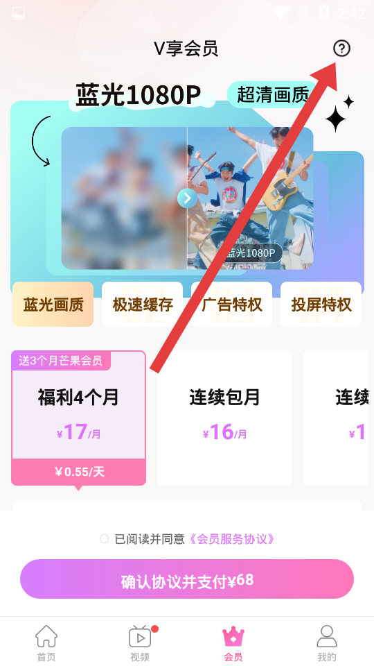 1、打開(kāi)韓劇TV,點(diǎn)擊底部會(huì)員進(jìn)入V享會(huì)員頁(yè)面,再點(diǎn)擊右上角圓形問(wèn)號(hào)圖標(biāo)。