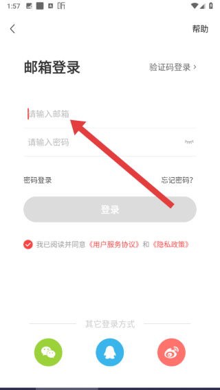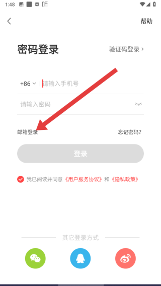 3、在進(jìn)入到密碼登錄頁面中,還可以點(diǎn)擊郵箱登錄按鈕,切換郵箱登錄。