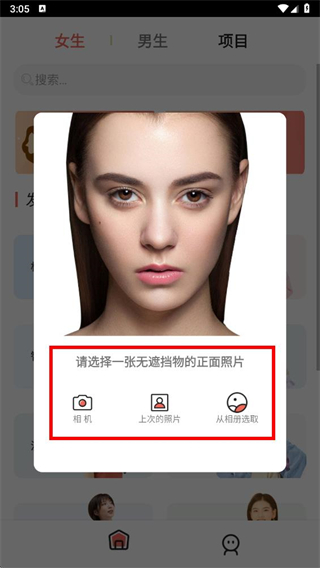 3、可以直接拍照然后換發(fā)型,可以在相冊(cè)選擇有人臉的圖片來(lái)?yè)Q發(fā)型。