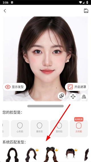 3、成功上傳照片后,軟件會(huì)自動(dòng)檢測(cè)臉型,點(diǎn)擊選擇滿意的發(fā)型。
