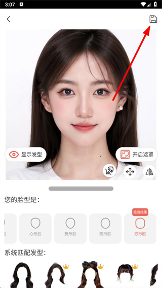 4、找到滿意的發(fā)型效果后,點(diǎn)擊界面右上角的保存圖標(biāo),就能將帶有新發(fā)型的照片保存。