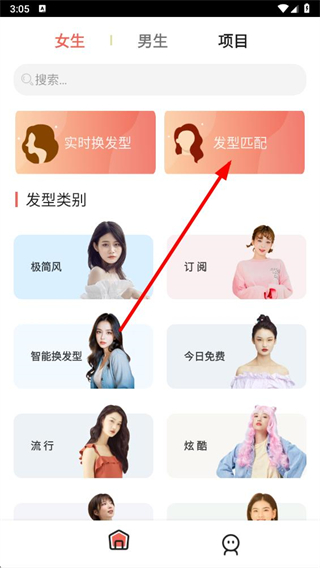 1、打開(kāi)全棧發(fā)型設(shè)計(jì)軟件,在首頁(yè)點(diǎn)擊發(fā)型匹配功能選項(xiàng),準(zhǔn)備進(jìn)行發(fā)型匹配操作。