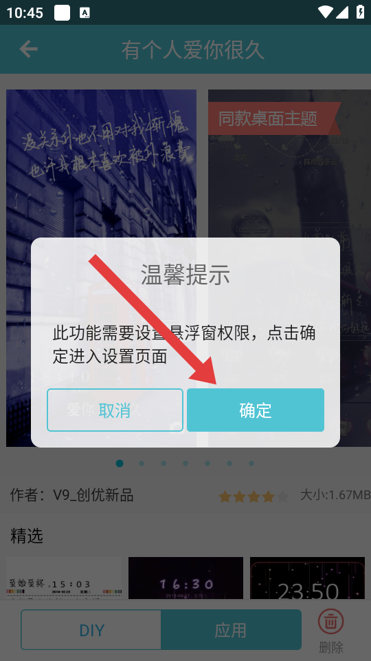 4、彈出溫馨提示需設(shè)置懸浮窗權(quán)限后,點擊確定按鈕,即可使用該鎖屏壁紙。