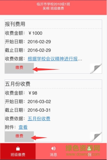 3、擊“班級繳費”按鈕系統(tǒng)會顯示出當前需要繳費的界面。點擊繳費按鈕按照支付使用銀行卡擇繳費方式進行繳費。