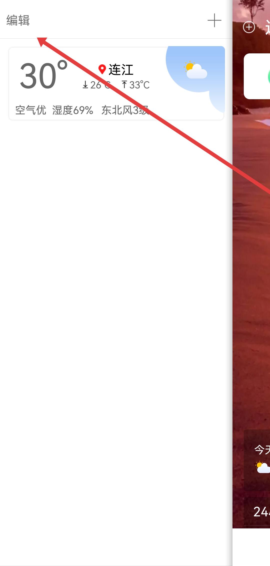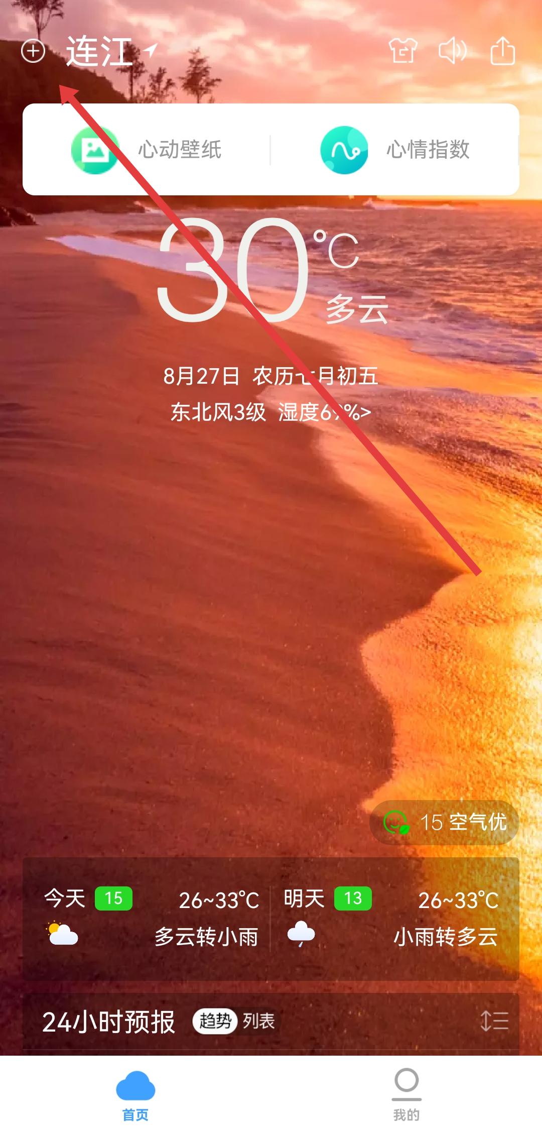 1、在360天氣的首頁,需要點(diǎn)擊左上角的+號圖標(biāo),打開已添加城市的管理列表。