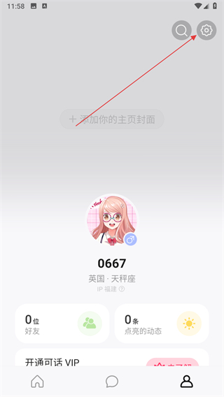 2、在個(gè)人頁面中,點(diǎn)擊右上角的設(shè)置圖標(biāo),進(jìn)入設(shè)置界面。