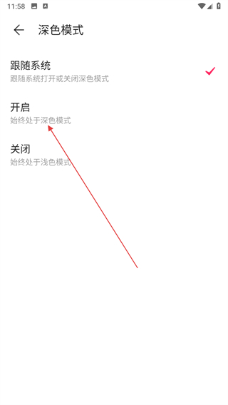 4、進(jìn)入深色模式設(shè)置頁后,點(diǎn)擊開啟選項(xiàng),即可開啟深色模式。