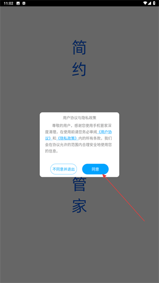 1、打開手機(jī)管家深度清理APP,進(jìn)入時(shí)會(huì)彈出用戶協(xié)議與隱私政策,點(diǎn)擊同意的按鈕。