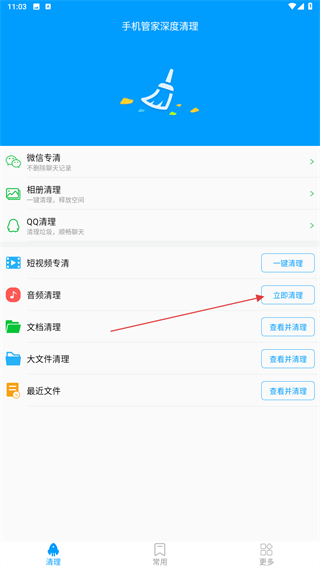 2、在首頁(yè)內(nèi),找到音頻清理并點(diǎn)擊右側(cè)立即清理的按鈕。