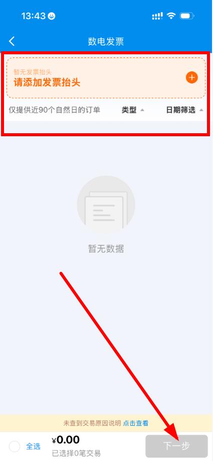 4、點擊請?zhí)砑影l(fā)票抬頭進行添加完成后,點擊下一步,按照提示完成發(fā)票開具操作。