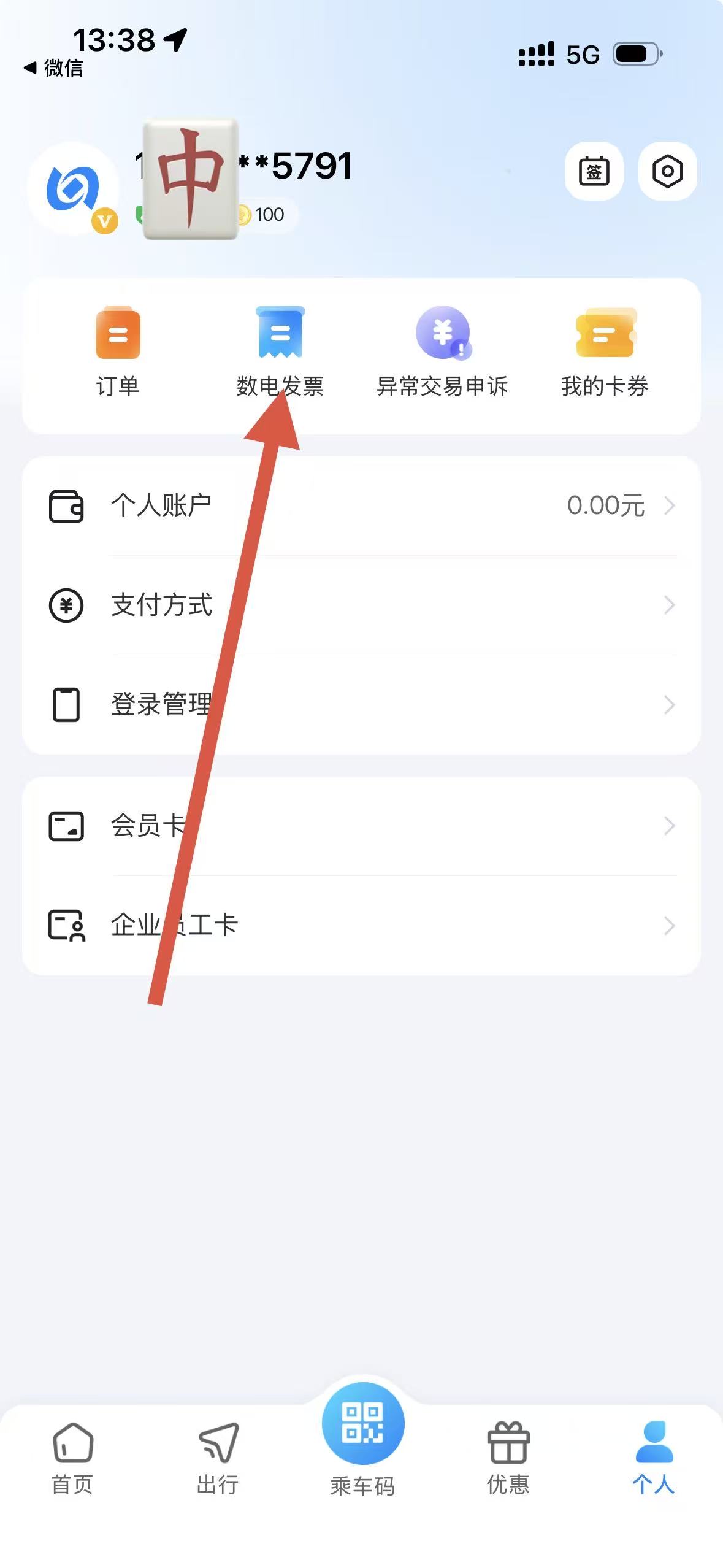 2、在個人界面中,點擊數(shù)電發(fā)票選項。