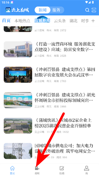 1、在云上應(yīng)城APP首頁(yè),點(diǎn)擊底部視頻選項(xiàng),進(jìn)入視頻界面。