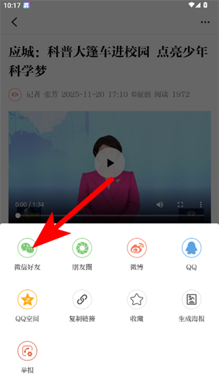 4、在分享選項(xiàng)界面,選擇要分享的渠道,如微信好友,即可完成視頻分享操作。