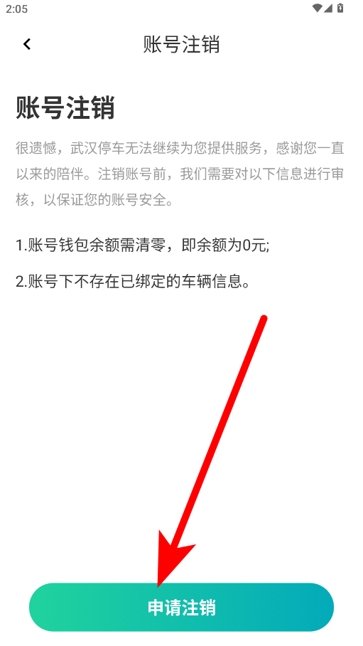4、閱讀賬號注銷條件,確認賬號錢包余額為0元且無已綁定車輛信息后,點擊申請注銷按鈕,完成賬號注銷操作。