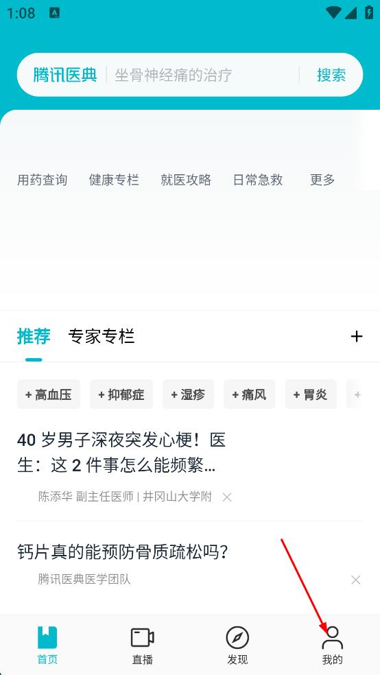 2、在騰訊醫(yī)典首頁(yè),點(diǎn)擊右下角我的,進(jìn)入個(gè)人頁(yè)面。