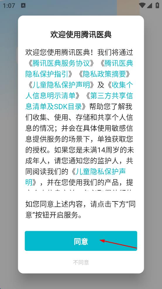 1、打開(kāi)騰訊醫(yī)典,在彈出的服務(wù)協(xié)議等提示頁(yè)面,點(diǎn)擊同意,進(jìn)入騰訊醫(yī)典首頁(yè)。
