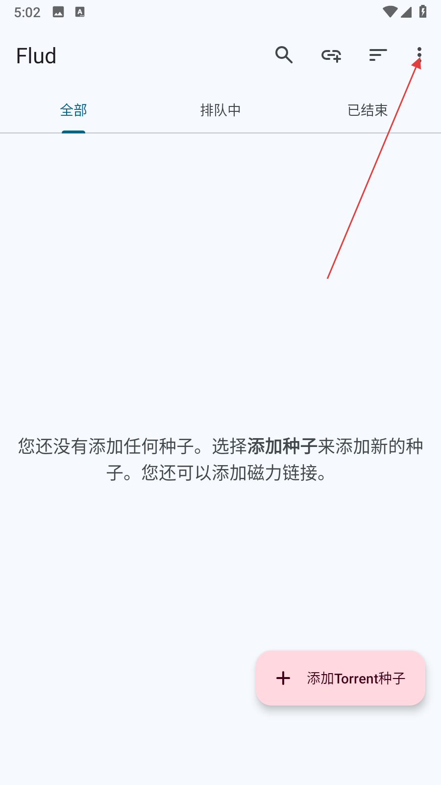 1、打開Flud應用,點擊界面右上角的三點菜單圖標,彈出包含設置等選項的菜單列表。