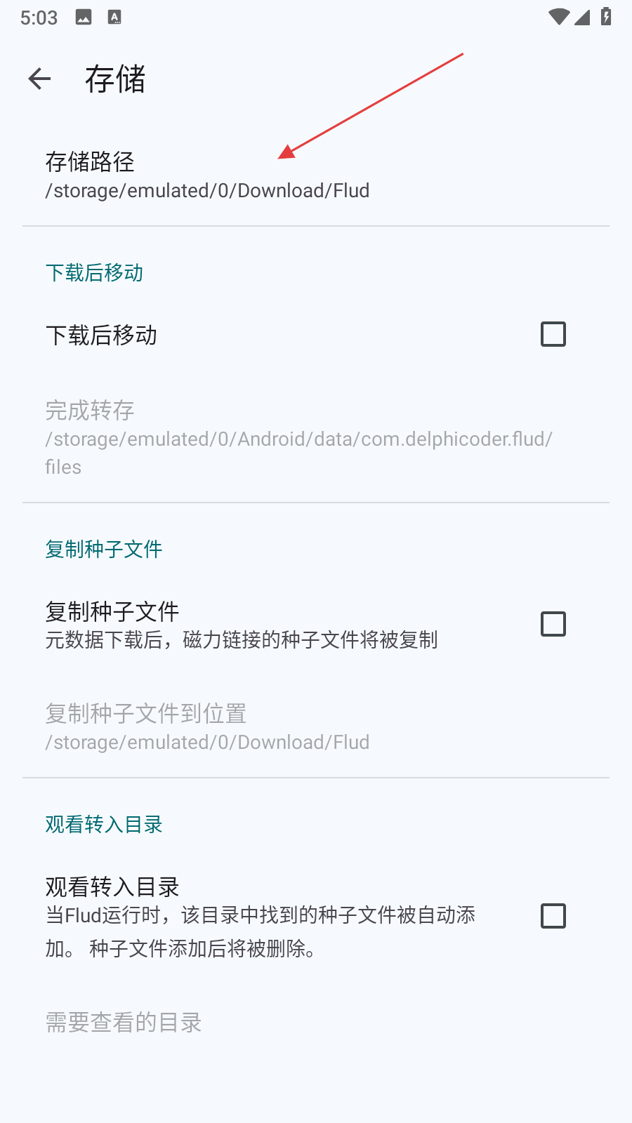 4、在存儲設置界面,點擊存儲路徑,然后選擇或輸入新的存儲路徑,即可完成Flud存儲路徑的更改。