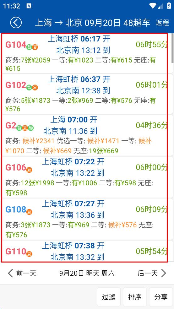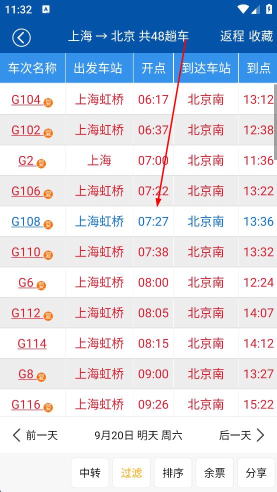4、點(diǎn)擊查詢后,會顯示上海到北京的列車列表,包含車次名稱、出發(fā)車站、開點(diǎn)、到達(dá)車站、到點(diǎn)等信息,點(diǎn)擊具體車次,還能查看該車次不同座位類型的余票及價(jià)格等詳細(xì)內(nèi)容。