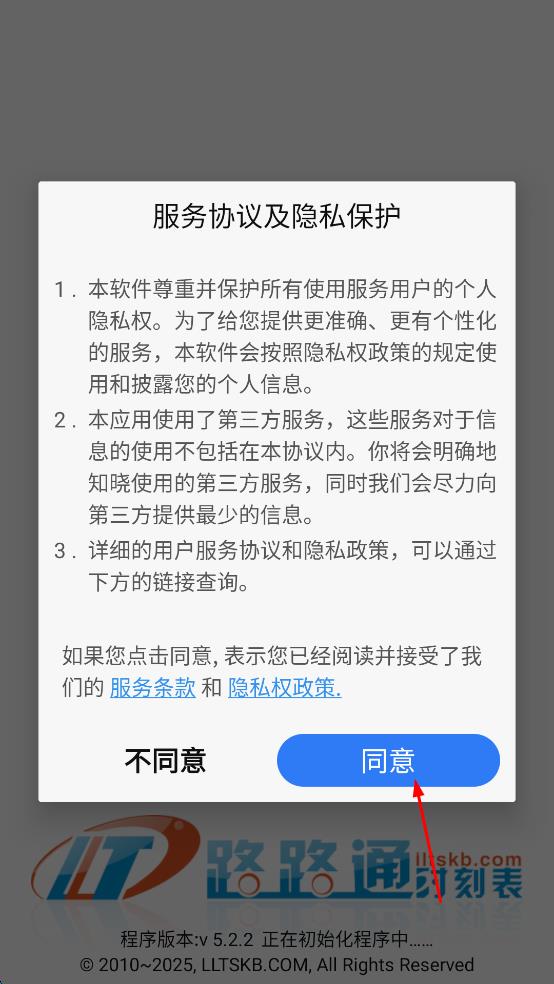 1、打開路路通軟件,會彈出“服務(wù)協(xié)議及隱私保護(hù)”提示框,仔細(xì)閱讀相關(guān)內(nèi)容后,若同意,點(diǎn)擊“同意”按鈕,進(jìn)入軟件主界面。