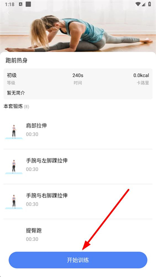 3、進(jìn)入跑前熱身訓(xùn)練詳情頁,查看相關(guān)訓(xùn)練信息,確認(rèn)后點(diǎn)擊下方的開始訓(xùn)練按鈕。