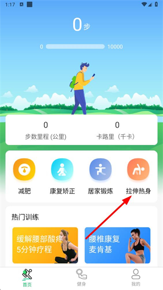 1、打開運(yùn)動(dòng)走路計(jì)步器app,在首頁界面中,點(diǎn)擊拉伸熱身選項(xiàng)。