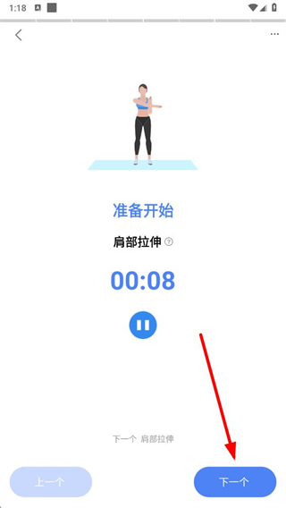 4、進(jìn)入訓(xùn)練界面,根據(jù)提示準(zhǔn)備開始動(dòng)作,完成當(dāng)前動(dòng)作倒計(jì)時(shí)后,點(diǎn)擊下一個(gè)按鈕,進(jìn)行后續(xù)拉伸動(dòng)作訓(xùn)練。