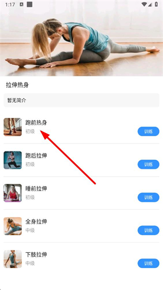 2、進(jìn)入拉伸熱身頁面后,在訓(xùn)練項(xiàng)目列表里,點(diǎn)擊跑前熱身。