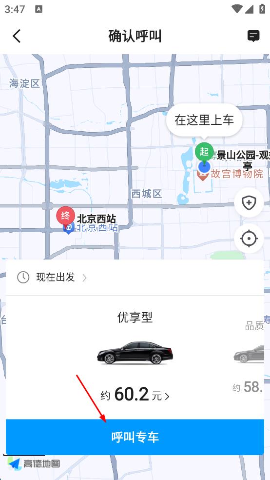 3、目的地選擇完成后,進(jìn)入確認(rèn)呼叫頁面,查看預(yù)估費(fèi)用等信息,確認(rèn)無誤后,點(diǎn)擊頁面底部“呼叫專車”按鈕,等待司機(jī)接單并前來接駕。