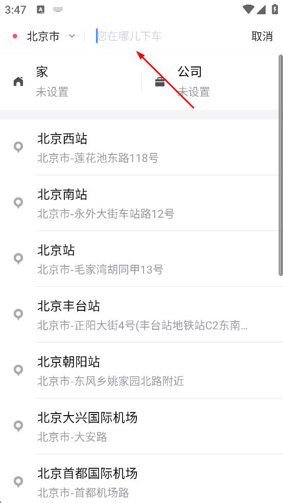 2、在目的地輸入頁面,輸入前往的目的地,軟件會(huì)顯示相關(guān)的地點(diǎn)選項(xiàng),選擇好目的地。