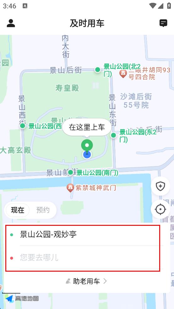 1、打開及時(shí)用車軟件,進(jìn)入主界面后,確認(rèn)上車地點(diǎn)后,然后點(diǎn)擊“您要去哪兒”輸入框,進(jìn)入目的地輸入頁面。