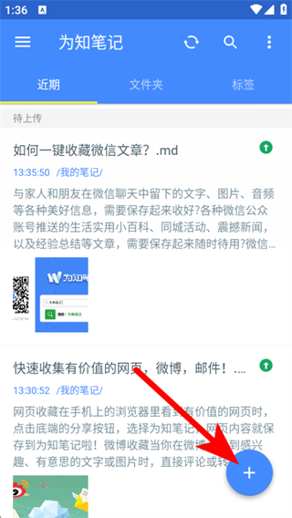 1、在為知筆記首頁,點擊右下角+號,進(jìn)入筆記創(chuàng)建選項頁面。