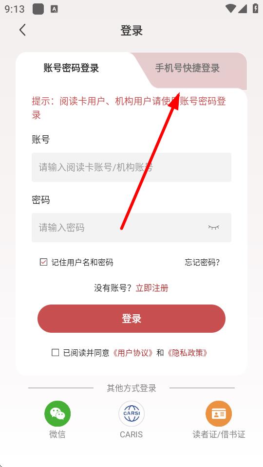 3、在登錄界面,若您有賬號(hào),可選擇賬號(hào)密碼登錄,輸入閱讀卡賬號(hào)/機(jī)構(gòu)賬號(hào)和密碼后點(diǎn)擊登錄;也可以選擇手機(jī)號(hào)快捷登錄。