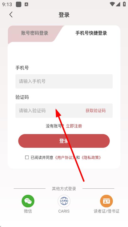 4、選擇手機(jī)號(hào)快捷登錄時(shí),輸入手機(jī)號(hào),點(diǎn)擊獲取驗(yàn)證碼,收再點(diǎn)擊登錄即可完成登錄,若沒有賬號(hào),點(diǎn)擊登錄界面下方的立即注冊(cè),按提示完成注冊(cè)后登錄。