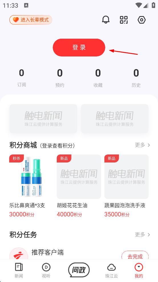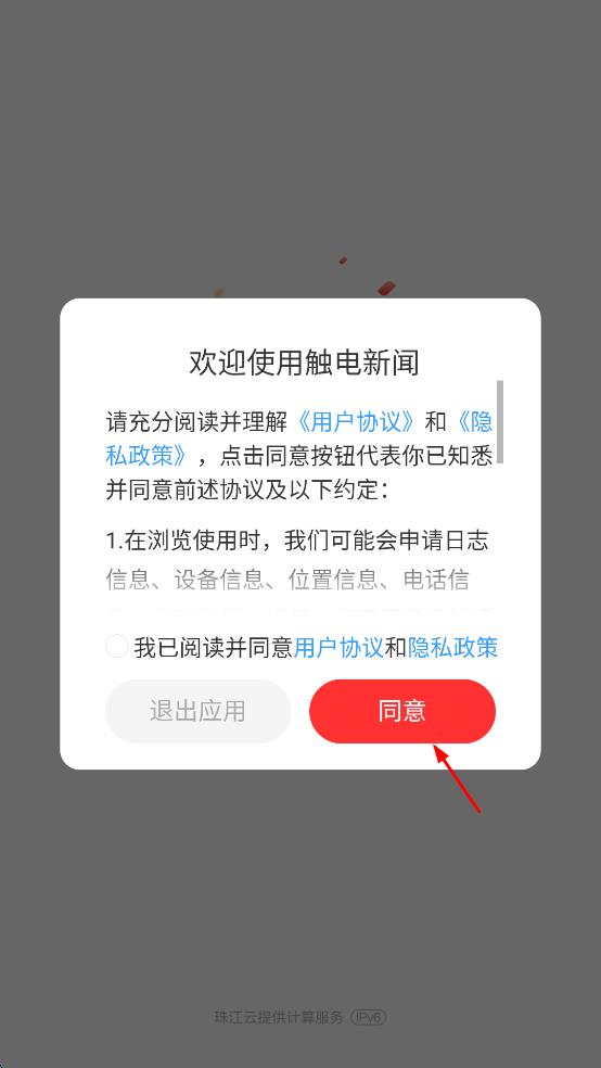 1、打開觸電新聞應(yīng)用,在彈出的歡迎界面中,點擊“同意”按鈕,以表示已閱讀并同意用戶協(xié)議和隱私政策。