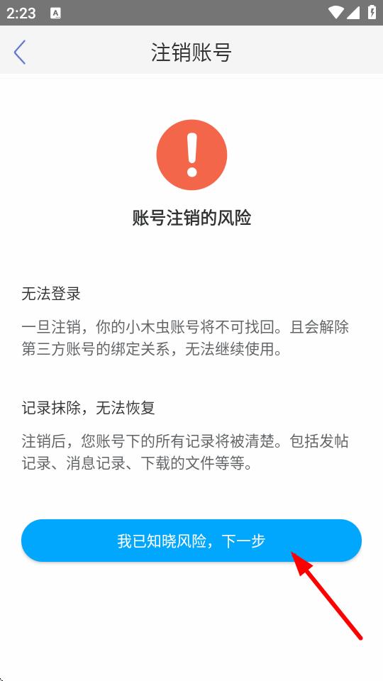 3、在注銷賬號(hào)頁面,閱讀賬號(hào)注銷的風(fēng)險(xiǎn)提示后,點(diǎn)擊我已知曉風(fēng)險(xiǎn),下一步。