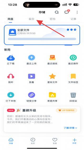 1、打開115生活A(yù)PP,在首頁正上方點擊備份的標(biāo)簽。
