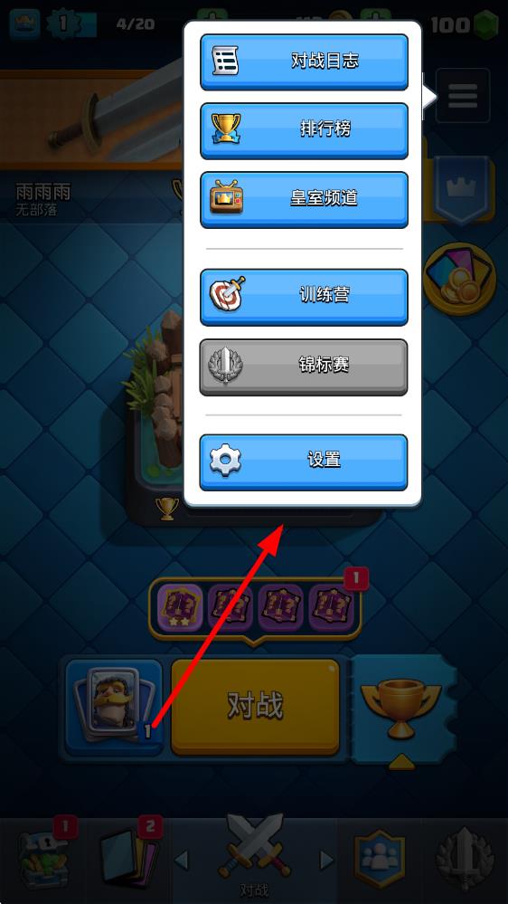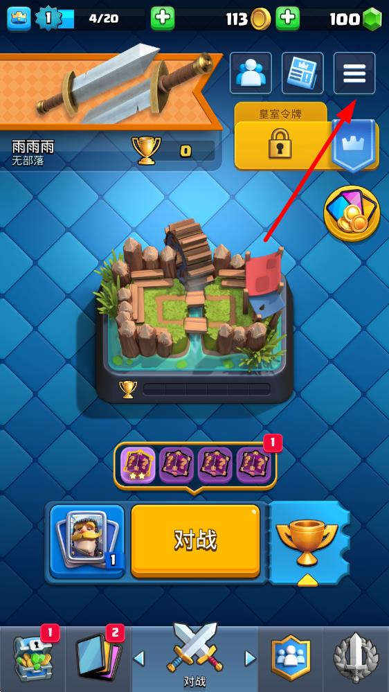 1、進(jìn)入皇室戰(zhàn)爭游戲主界面,點擊右上角三條橫線樣式的菜單按鈕,展開功能選項列表。