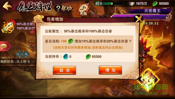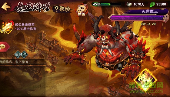 魔王獎勵處了每次挑戰(zhàn)都會獲得銀兩和進(jìn)階石外,把它消滅了還會根據(jù)傷害進(jìn)行獎勵,前10名都會獲得一個魔王寶箱,名次越高獎勵當(dāng)然也就越豐富的呢。