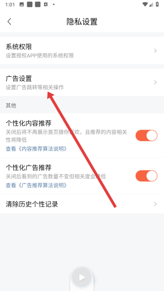 2、在進(jìn)入到隱私設(shè)置頁面中,可以點(diǎn)擊廣告設(shè)置選項,進(jìn)入設(shè)置。