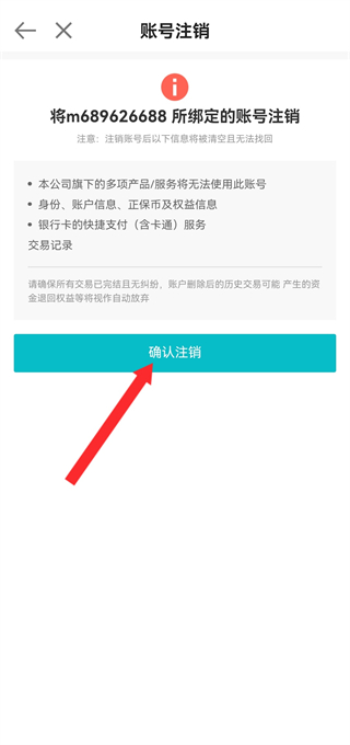 4、在注銷(xiāo)確認(rèn)頁(yè)面,點(diǎn)擊確認(rèn)注銷(xiāo)按鈕,完成賬號(hào)注銷(xiāo)的操作。