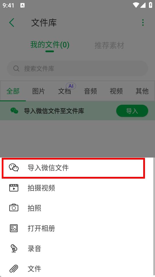 4、在彈出的菜單中,可選擇導(dǎo)入微信文件等多種導(dǎo)入方式,也按照對(duì)應(yīng)提示完成文件導(dǎo)入。
