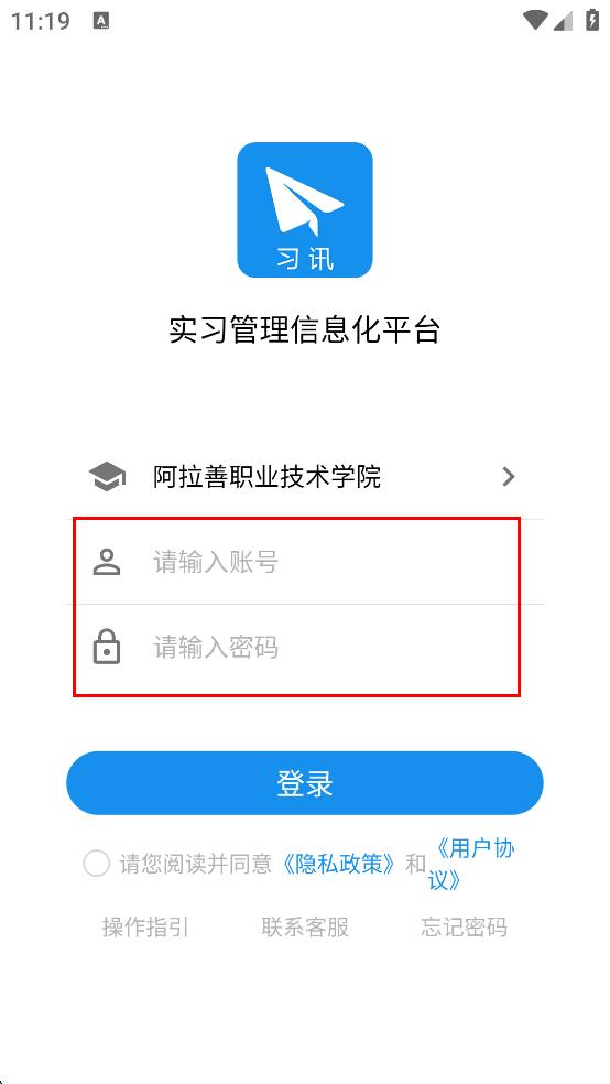 3、在實習(xí)管理信息化平臺登錄頁面,輸入賬號和密碼。