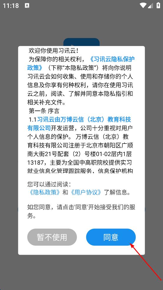 1、打開習(xí)訊云,在彈出的隱私保護政策頁面,點擊同意,進入學(xué)校選擇頁面。