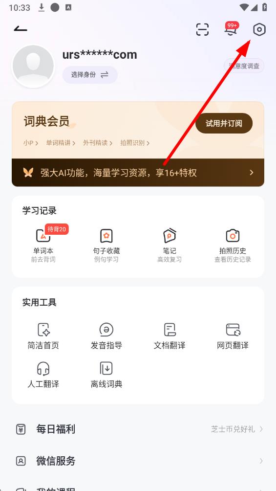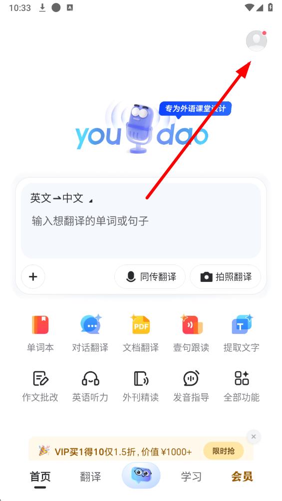 1、打開有道詞典app,點(diǎn)擊首頁右上角的頭像圖標(biāo),進(jìn)入個(gè)人中心頁面。