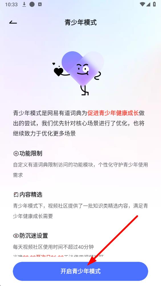 4、在青少年模式頁面,閱讀相關(guān)介紹后,點(diǎn)擊開啟青少年模式按鈕,即可成功開啟該功能。