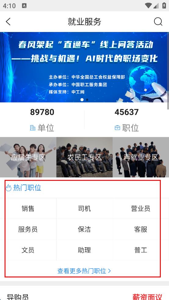 4、在就業(yè)服務(wù)頁面,可查看熱門職位等就業(yè)相關(guān)信息,還能根據(jù)自身需求,進一步瀏覽應(yīng)屆生專區(qū)、農(nóng)民工專區(qū)、再就業(yè)專區(qū)等不同專區(qū)的內(nèi)容。