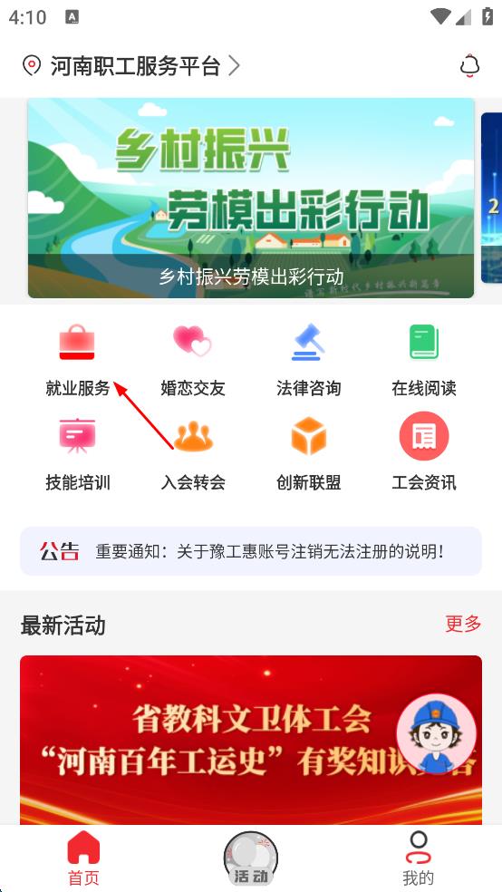 3、在河南職工服務(wù)平臺主界面,找到“就業(yè)服務(wù)”選項并點擊,進入就業(yè)服務(wù)頁面。