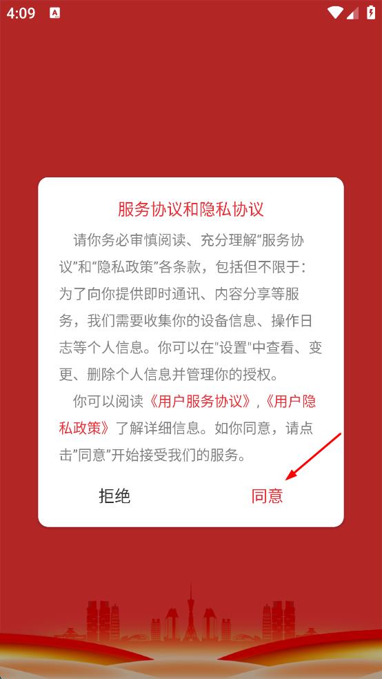 1、打開職工服務(wù)類應(yīng)用,彈出服務(wù)協(xié)議和隱私協(xié)議提示框,仔細閱讀相關(guān)內(nèi)容后,點擊“同意”按鈕,進入職工服務(wù)中心列表頁面。